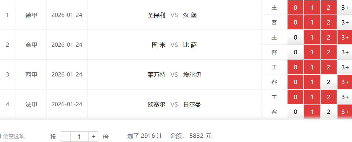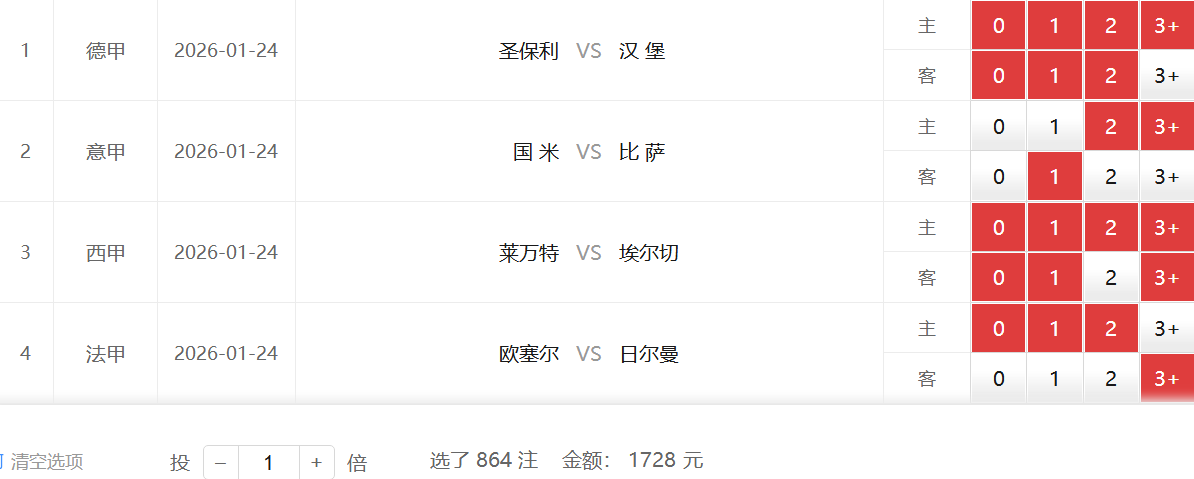 解析:今日4场进球——2数据、1.5数据、0.25和0数据数据各1场,今日建议1728方案作为首选,5832方案关键在于2点:比萨的2球和巴黎的1球,一旦无法打出,有着亏损的风险,慎选!