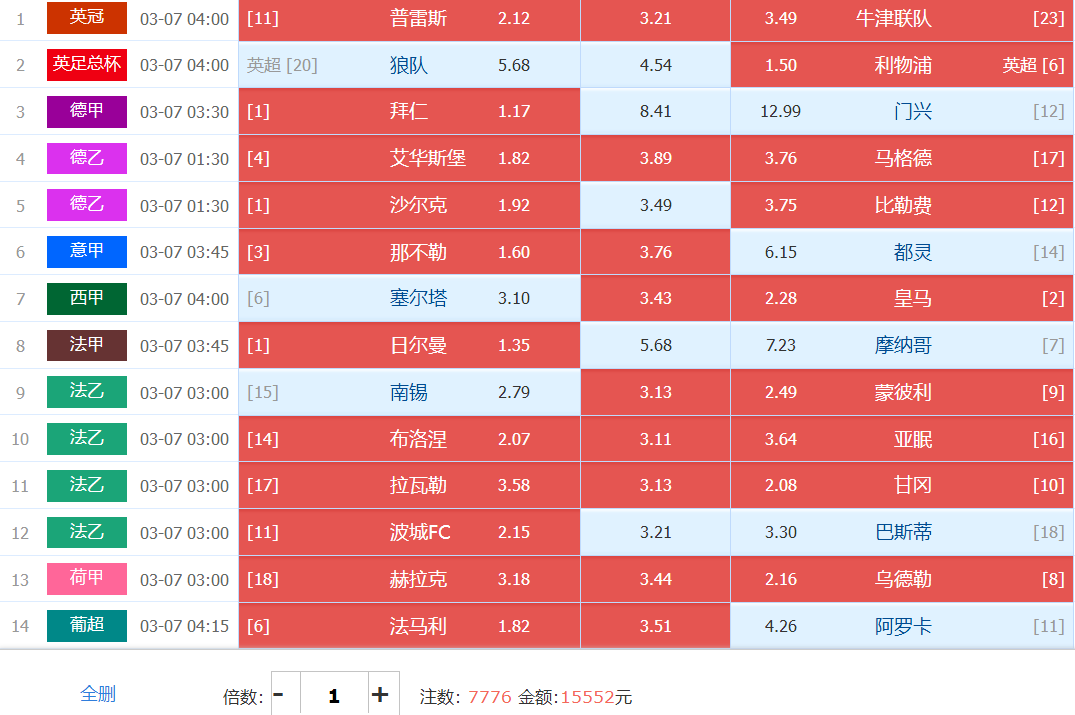 15552元14场初始单如下:今日14场虽有滚存,但建议正常投入即可