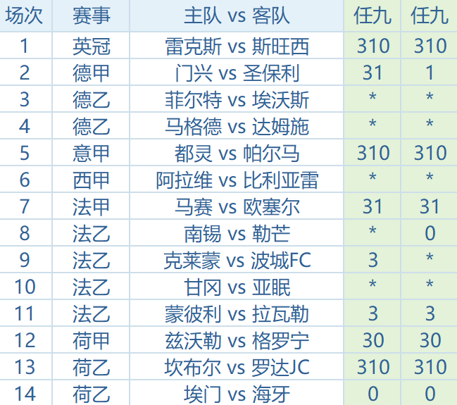 双选:门兴31、阿拉维斯31、南锡10、甘冈30、兹沃勒30